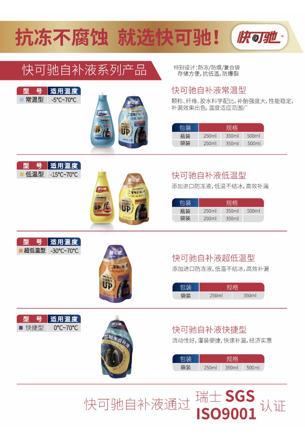 瞄准电动车维修市场对于高质量、高效率补胎工具的切实需求,美国泰克旗下的二轮车轮胎修理品牌快可驰,集独家配方、核心科技、匠心工艺、高端品质,研制了一系列防腐蚀、修补快、时效长、用量省的自补液产品,受到了市场的高度肯定和青睐追捧。
