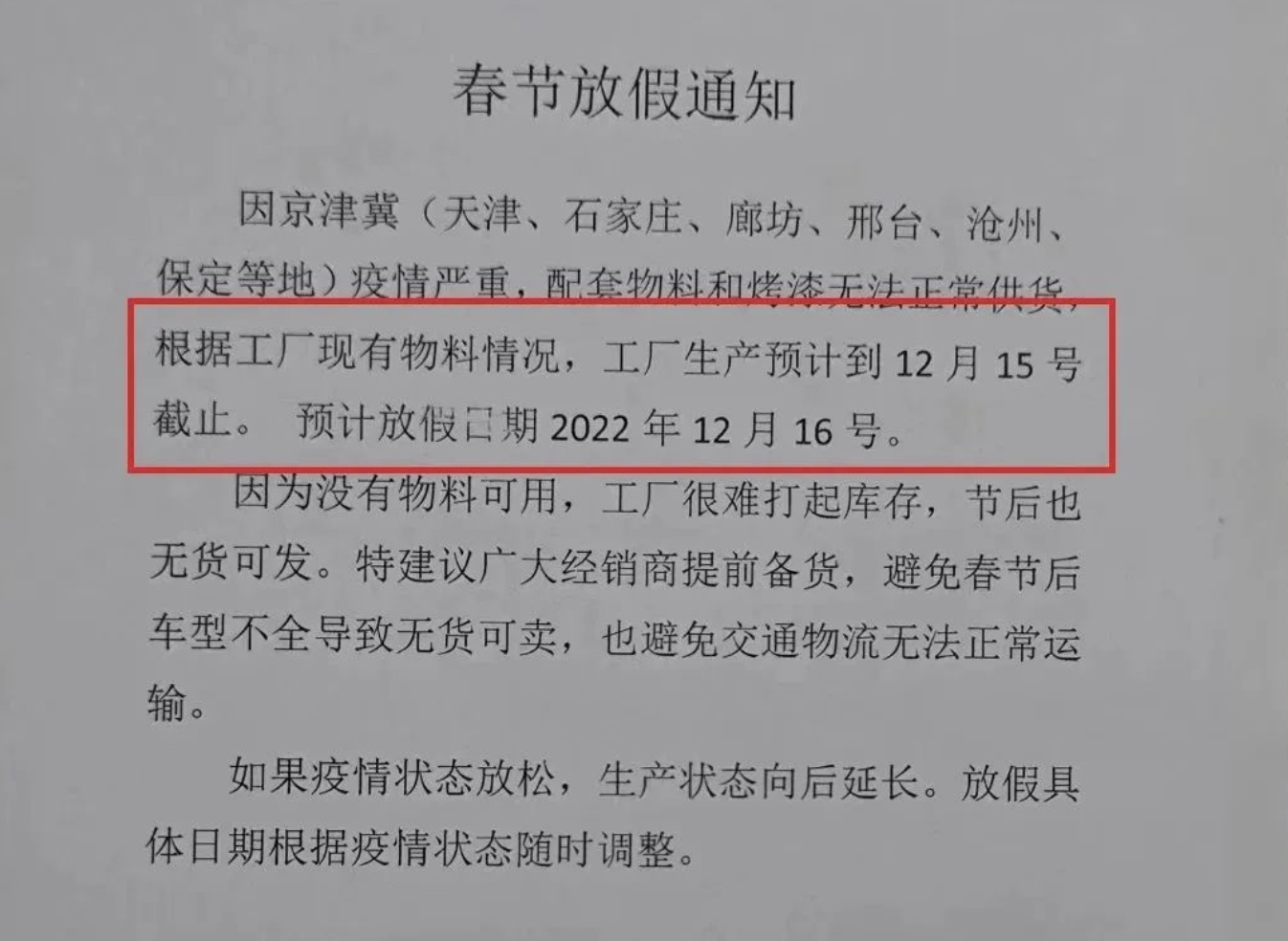 有备无患!已有厂家被迫提前放假,留给你备货的时间不多了! 编辑:芒果文化工作室 发布于2022-12-06 10:23 点击:次 临近年底,受寒潮来袭、疫情反复、物流受阻等因素影响,很多电动车配套厂、整车厂已经提前发布春节放假通知,备货刻不容缓。 一、最强寒潮席卷全国 今冬以来最强寒潮正陆续席卷我国大部地区,波及范围超30省区市,多地累计降温幅度达到15℃甚至超过20℃,随着冬季来袭,未来雨雪天气将增多,从而影响物流运输。 二、物流受阻成本上涨 在寒潮天气和疫情防控的双重压力下,各地物流受阻的同时,成本也将增加。 三、工厂放假提前 今年过年比往年早,加上疫情、产能等因素,不少整车厂和配套厂,都把春节假期提上了日程,甚至表示没有物料可用,节后也无货可发。 手中有粮,心里不慌!提醒广大经销商:如果你有备货需求,还请趁早提前准备!