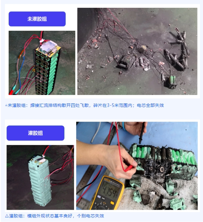 特别是行业独创的集泰-有机硅发泡胶F6351等最新科技产品,更是具备卓越的绝缘性、导热性、耐高低温性、弹性缓冲能力、无死角密封性、阻燃等级V0级、轻量化、易拆卸等差异化产品竞争优势,可对动力电池模组实现全灌封,起到强大的绝缘、隔热、防火、减震、缓冲、保护等作用,一旦意外发生能够迅速切断连锁反应,使热失控只在小范围进行,有效防止电池模组爆燃。